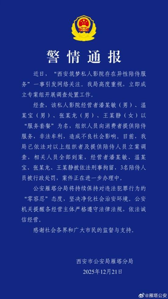 近日,“西安筑梦私人影院存在异性陪侍服务”相关情况引发网络关注。我局对此高度重视,已第一时间成立专案组,全面开展调查与处置工作。