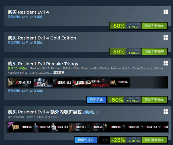 近日,《生化危机4重制版》在Steam平台迎来历史最低价格,目前可享4折优惠,标准版售价79.2元,黄金版售价99.2元,此次折扣活动将持续至12月19日。