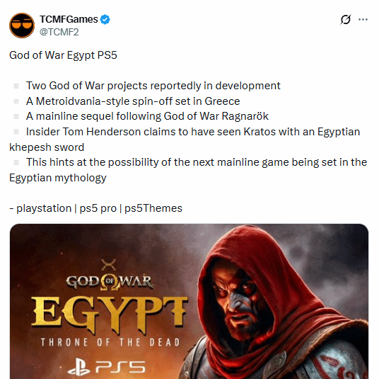 12月21日,推特上颇具知名度的游戏博主@TCMF2整理汇总了有关《战神》新作的相关信息,称当前有两款新作处于开发进程中,其一为以埃及为背景的正统续作,另一款则是类银河战士恶魔城类型的衍生作品。