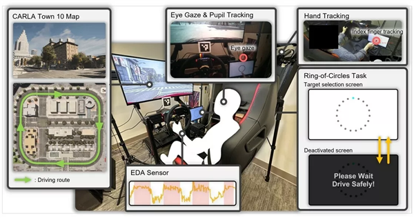 研究人员选取16名受试者,安排他们在高仿真驾驶模拟器中完成两项测试:一项是专注驾驶,另一项是驾驶时同时操作触屏执行常见任务。在此过程中,研究人员会追踪记录受试者的眼球运动、手部动作、瞳孔扩张程度以及皮肤电导率等多项指标。