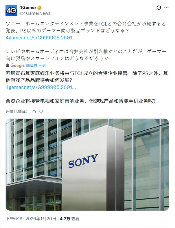 据日本经济新闻消息,索尼集团于今日(1月20日)发布公告称,拟将电视业务从集团体系内剥离,并与中国电视行业龙头企业TCL集团共同组建合资公司。