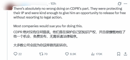 大部分玩家都通过官方渠道表达了支持立场,他们认为mod作者的这一行为侵犯了CDPR所拥有的著作权,而这种底线是绝对不应该被逾越的。