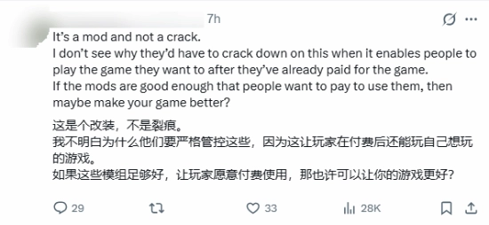 据了解,此次被下架的mod因需通过mod作者的Patreon频道付费获取,违反了CDPR针对社区内容创作者的禁止性规定。CDPR在知悉相关情况后,依据千禧年数字版权法对该mod实施了强制下架处理。