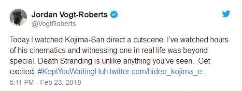近日,曾执导《金刚:骷髅岛》的好莱坞知名导演——同时也是《合金装备》真人电影导演的Jordan Vogt-Roberts,与小岛秀夫互动频繁。他不久前受小岛秀夫邀请观看了《死亡搁浅》的过场动画,观影后这位好莱坞大导演给出了高度评价。