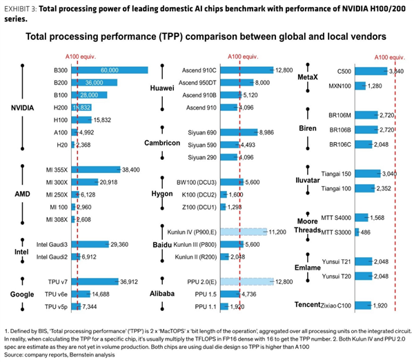 伯恩斯坦勾勒出一幅全球AI芯片的全景图谱,对多家厂商的TPP性能密度进行了横向对比,其参照基准设定为NVIDIA的A100显卡——这款产品虽已问世6年,却仍是众多AI大模型训练时所依赖的核心硬件。