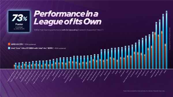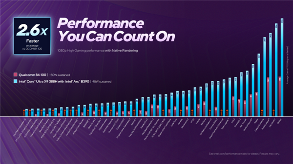 在原生性能表现上,配备B390的酷睿Ultra X9 388H在45W功耗条件下,相比53W的AMD Radeon 890M速度提升了82%,同时对高通骁龙X Elite的Adreno GPU形成了压倒性优势,领先幅度达到2.6倍。