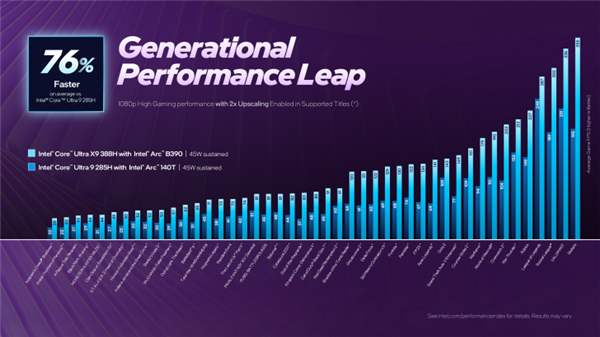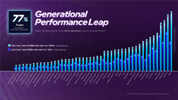 官方测试数据还表明,在1080p分辨率条件下,采用2倍缩放技术进行测试时,锐炫B390相比基于Xe+架构的Arrow Lake系列Arc 140T性能提升达77%,相较于Arc 140V则提升了76%。