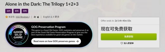 GOG平台目前可以免费获取经典恐怖游戏《鬼屋魔影三部曲(Alone in the Dark: The Trilogy 1+2+3)》。到发布这篇内容的时候,距离免费领取结束还有2天14小时。