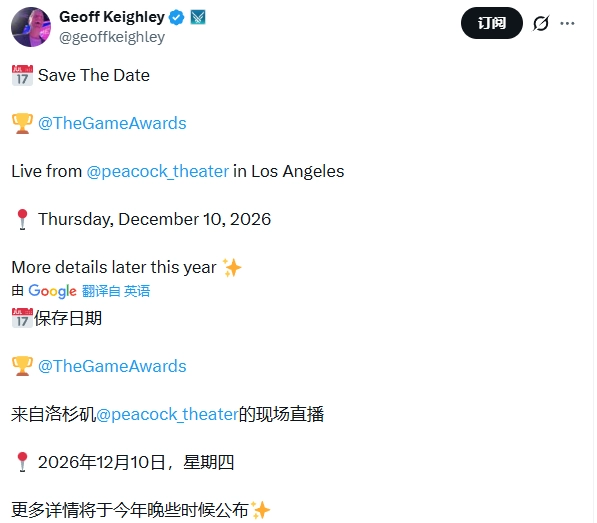 尽管今年还有不少备受期待的重磅游戏尚未推出,但关于年度游戏的竞争预测已经可以开始讨论了。主办方杰夫·基斯利已经正式宣布,2026年游戏大奖将在12月10日于加利福尼亚州洛杉矶的孔雀剧院举办并同步直播,举办场地和去年一致。