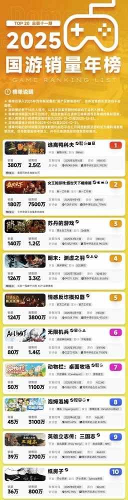 近期2025年度国产游戏销量排行榜公布,《明末:渊虚之羽》以126万份的销量与3.3亿元的销售额,在榜单中排名第四。