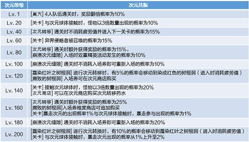 随着版本更新,次元等级上限已提升至Lv.200,并且当次元等级达到Lv.100时,将解锁全新功能[次元共鸣]。在特定的次元等级阶段,玩家能够享受到次元共鸣赋予的多项特权,包括奖励翻倍概率提高、[次元转移]通关时额外获取奖励的概率增加、暴走次元的出现概率提升等。
