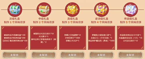 累积风味月饼解锁对应月饼宝箱,即可获取传说级变换礼包、潘多拉礼包、古代龙玉碎片、物品保护魔法药(勇者)等丰厚奖励。和G友一同共度团圆时刻,畅享满满福利!