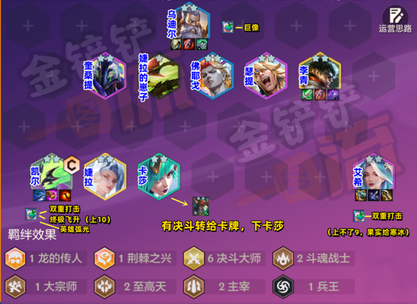 一图提示:1. 有决斗转职就给到卡牌,不要给卡莎;2. 乌迪尔没出巨像的话,就额外搭配婕拉或卡牌;3. 要是没有瑟提,就上阵皇子、船长和剑魔,开出3超级战队羁绊。