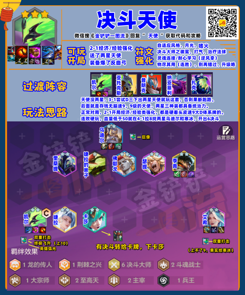 天使没两星的话,3-1阶段试着D三次牌,要是能出两星天使就走这套阵容,不然就果断换阵容。另外,天使的强化符文“终极飞升”在3-1阶段刷新的概率最高,这时候可以卡一下强化符文选择界面等它出现;过了这个阶段,就只能等“双重打击”这个强化符文了。