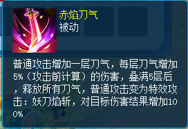 她的专属技能赤焰刀气能让每次普攻叠加一层刀气,每层刀气可提升自身5%的伤害。刀气叠满五层时,下一次普攻会变为特效攻击,伤害翻倍,效果十分强悍。