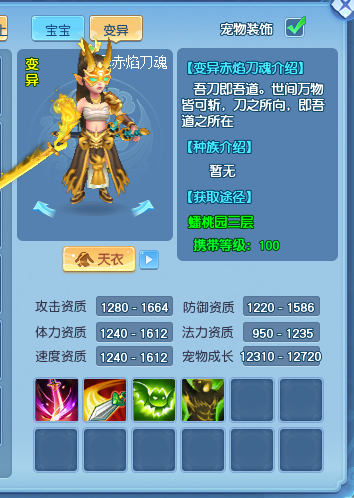 赤焰刀魂的攻击资质相当出色,1664这个数值可不是普通宠物能企及的。更值得称赞的是它其他几项能力的资质也都在1600左右,各方面都实力强劲,完全称得上是个六边形战士。
