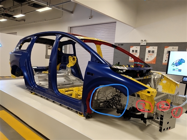 以理想i8的一体化压铸车体为例,图1、图2分别展示了理想i8的后部和前部车体,其中蓝色圈出的部分为一体压铸结构,红色标记1、2、3的依次是铝合金防撞梁、铝合金吸能盒和铝合金纵梁。