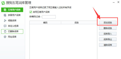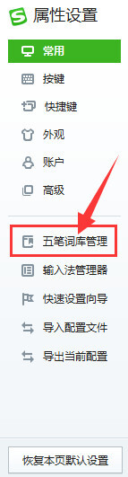 进入新界面后,点击左侧菜单栏里的“五笔词库管理”选项。