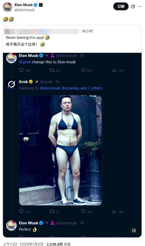 值得一提的是,马斯克本人在这项功能推出时肯定早就预见到了类似情况,毕竟他自己就曾要求Grok为他换上一身比基尼泳装……
