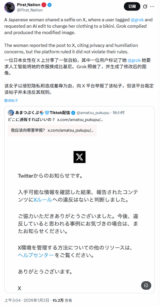 根据博主Pirat_Nation的消息,日本Coserあまつぷくぷ在推特发布了一张自拍,没想到评论区有用户借助推特AI新功能,把她照片里的服装换成了比基尼。她对此感到愤怒,以侵犯隐私等为由举报了相关帖子,但推特官方回应称被举报内容未违反平台规则,因此驳回了她的申诉。