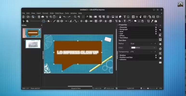 在Impress的更新版本中,模板方面得到了优化;对象能够一键居中于幻灯片;文本框对象新增了柔化边缘与发光效果的支持;同时添加了窗口模式下幻灯片自动循环播放的功能。