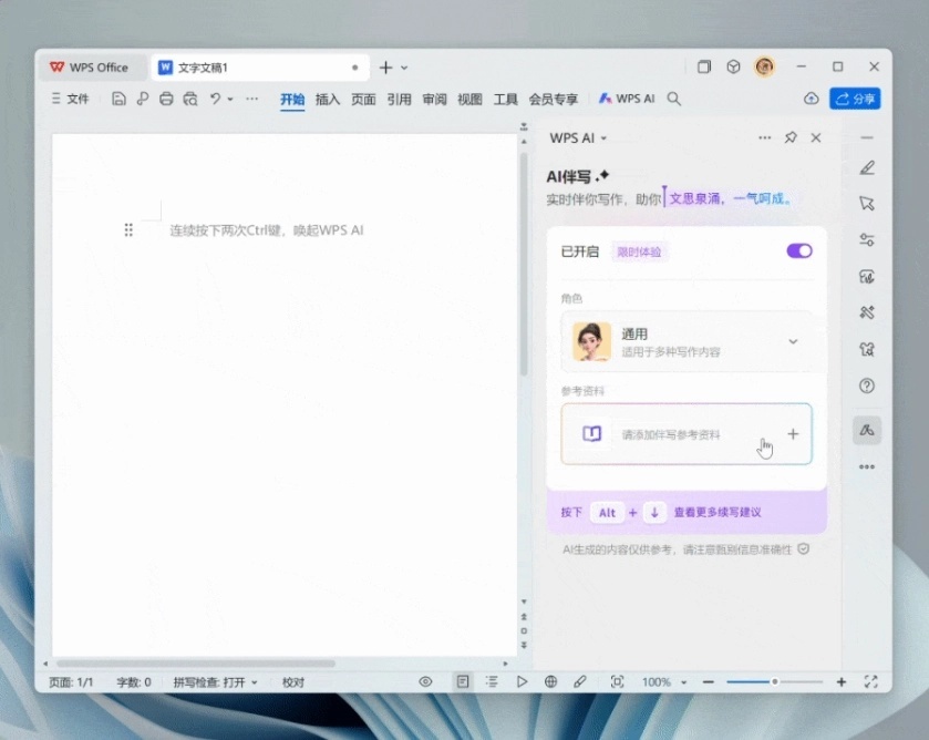 用户若想体验这一新功能,只需下载最新版的WPS Office for Windows,接着按以下步骤操作:打开WPS Office客户端,新建或打开一份本地文档,点击WPS AI图标,再选择AI伴写功能就行。