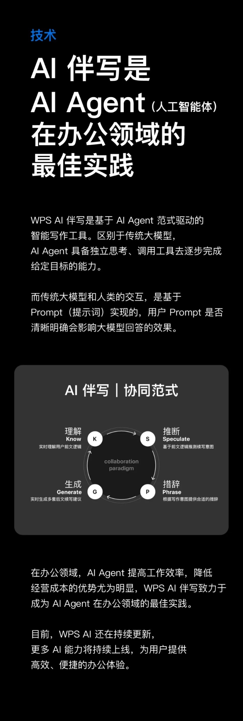 金山办公于昨日下午发布消息,旗下WPS Office新添了依托AI Agent技术的AI伴写功能,该功能致力于为用户打造一款可控性更强、操作更简便且专业可信的写作辅助工具。