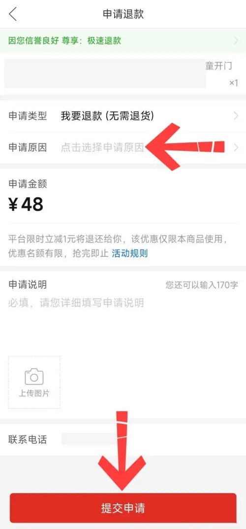 3.进入退款申请页面后,先选定退款理由,再点击“提交申请”按钮。