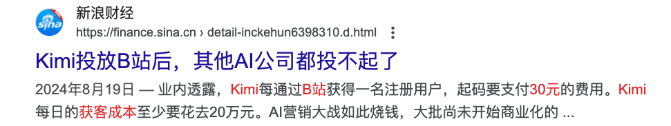 有内幕人士透露,Kimi信息流广告在B站的获客成本一度接近30元/人。