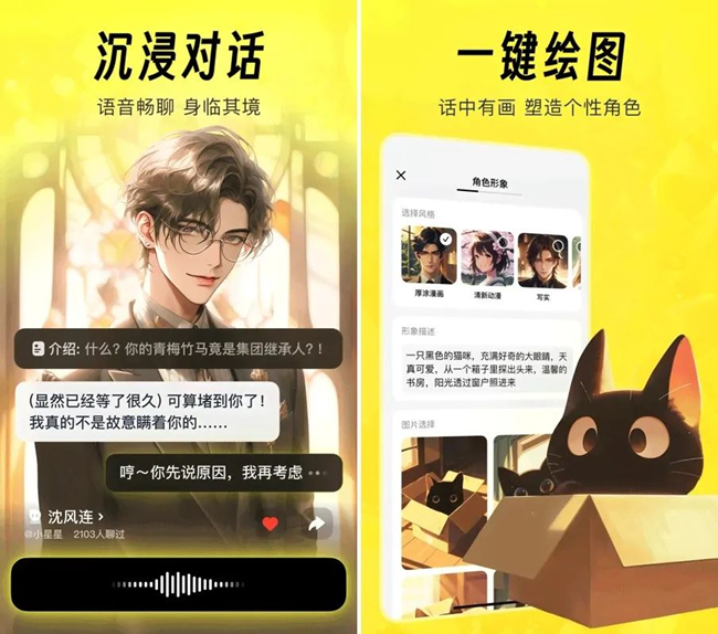 猫箱是字节跳动推出的又一款对标星野的AI社交产品,同样支持用户自主创建虚拟形象并生成带有情节的故事内容。一直以来,字节跳动都期望在社交领域打造出能与腾讯抗衡的产品,而猫箱也配备了添加好友、发送消息、语音通话等功能,便于用户借助该平台认识新朋友,扩大自己的社交圈。