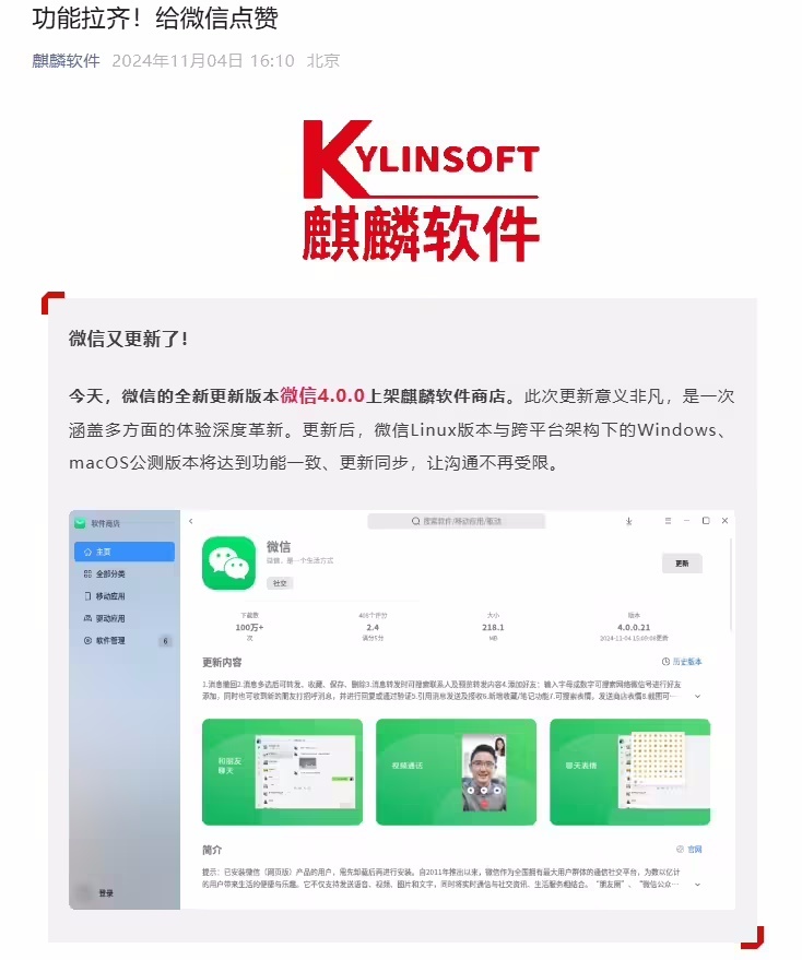 麒麟软件有限公司今日发布消息,微信Linux版4.0.0版本已更新并上架麒麟软件商店,官方特别指出此次更新具备里程碑式的重要意义。此次更新完成后,微信Linux版在功能设置与更新节奏方面,将与Windows及macOS平台的公测版本保持一致。