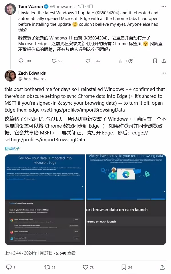 科技媒体The Verge的高级编辑Tom Warren于11月12日撰文指出,微软Edge浏览器曾在未征得用户同意时自动导入Chrome浏览器的标签页。对于这一行为,微软并未给出原因解释,不过在Edge近期的更新中已悄然修复了该问题。